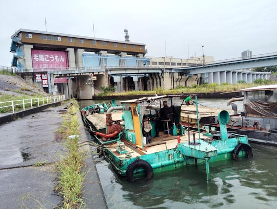 画像1では、伝馬船が毛馬閘門の閘室から出て、旧淀川(大川)の中之島方面へと向かおうとしている。船は中之島(中洲)の堂島川または
