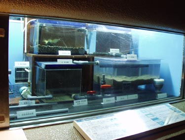 水温など魚類などの生命維持がなされているか、それを分かりやすく説明している水槽システム模型