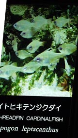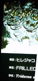 1 2 3 1. イトヒキテンジクダイ [拡大画像(x10091.jpg)] 2. 同上-イトヒキテンジクダイ [拡大画像(x10092.jpg)][拡大画像(x10093.jpg)] 3. ヒレジャコ 英名frilled clam, 学名Tridacna squamosa [拡大画像(x10094.jpg)]