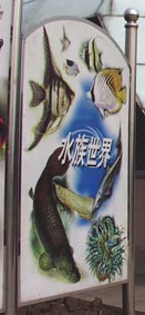 2 3![]() 4 5 6![]() 7 8![]() 1「水族世界」がある館]2館内風景(1)]3館内風景(2)]4展示魚(1)・アロワナ??]5展示魚(2)・中国語名は「七彩神仙」] 6展示魚(3)・中国語名は「雀魚善」(注意: 魚善は、魚偏に善と書き、一文字)]7展示魚(4)・中国語名は「黄金戦船」] 8展示魚(5)・中国語名は「東洋刀魚」].