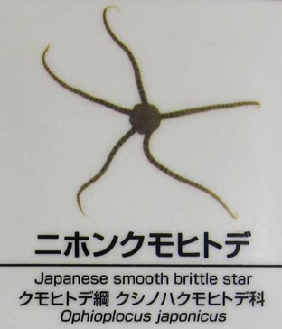 (z20235, x26328.jpg)/すみだ水族館][画像(z22422.jpg)・画像(z22423.jpg)/しながわ水族館]. Japanese sea perch: n.[魚][日本産]スズキ. Japanese silver bream: n.[魚]キヂヌ、キビレ. Japanese smooth brittle star: n.[動]ニホンクモヒトデ, Ophioplocus japonicus [ 画像(z22515.jpg)/葛西水族園]. Japanese snapping shrimp: n.[動]テナガテッポウエビ.