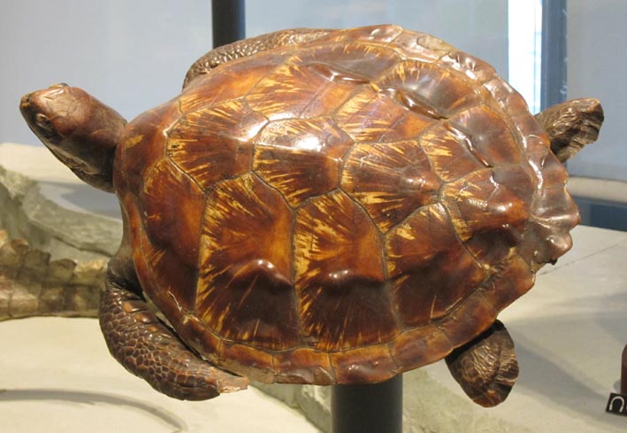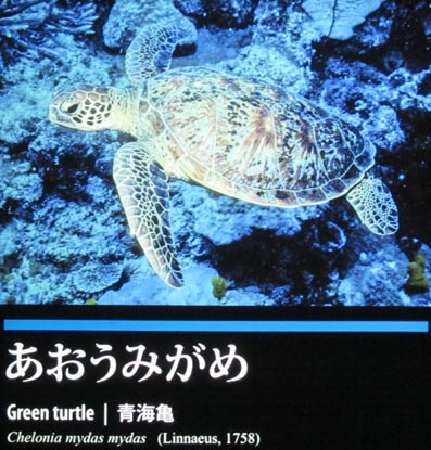 /black turtle: n.[スペイン語]tortuga torita o verde del Pacífico, [学名]Chelonia mydas agassizii. ・ [学名]Chelonia mydas: n.アオウミガメ. [参考]アオウミガメ: [学名]Chelonia mydas mydas [画像(z22286.jpg)/横須賀市立自然人文博物館; 世界中の熱帯域から温帯域に分布するウミガメの仲間; 甲羅は和甲(わこう)として装飾品などに利用される; この標本は全体的に赤みを 帯びた色彩変異個体といわれる]. /green turtle: [動]アオウミガメ(青海亀), Chelonia mydas mydas (Linnaeus, 1758) [ウミガメ科] [画像: (z22140.jpg)/京都水族館] [参考]熱帯から亜熱帯の海に分布; 大きくなると甲羅の長さは1mを超える; 日本では小笠原諸島・南西諸島に産卵のため上陸する; 海洋汚染、海岸開発、漁船の網による混獲などで減少、ワシントン条約で国際取引は禁止されている]. ・ green turtle, green sea turtle, [スペイン語]tortuga verde, Chelonia mydas: [ 画像(z22078.jpg)][中国・上海自然博物館]. /hawksbill, hawksbill turtle: n.[動]タイマイ(=tortoiseshell turtle), Eretmochelys imbricata, [スペイン語]tortuga carey [ウミガメの一種; 甲羅(こうら)でべっ甲を製する]、ベッコウガメ. ・ hawksbill sea turtle, Eretmochelys imbricata [画像(z22077.jpg)] [中国・上海自然博物館]. ・ tortoiseshell turtle, hawksbill, hawksbill turtle: n.[動]タイマイ(ベッコウガメ) [参考]ウミガメ科のカメ; 海亀の一種; 雑食性; 甲羅でべっ甲を製する. /leatherback, leatherback turtle: n.[動]オサガメ(leathery turtle)[学名: Dermochelys coriacea]、ヤサバ [熱帯産の大ウミガメ; 海ガメの最大種](trunkback turtle) [スペイン語]tortuga tora. ・ leatherback sea turtle, Dermochelys coriacea [画像(z22079.jpg)] [中国・上海自然博物館]. /loggerhead turtle: n.[動]アカウミガメ(赤海亀), Caretta caretta, [スペイン語]tortuga cabezona. ・ loggerhead sea turtle, Caretta caretta [画像(z22076.jpg)/中国・上海自然博物館]. /olive ridley turtle: n.[動]ヒメウミガメ、[スペイン語]tortuga paslama, Lepidochelys olivacea. /sea turtle: ウミガメ、海ガメ、海亀 [スペイン語]tortuga marina, tortuga de mar. turtleback: n.[海]亀甲(きっこう)甲板(=turtle deck) [激浪に耐えるように船首や船尾などに設けた亀甲状の甲板]; 亀の甲、亀甲、背甲、甲羅、adj.亀甲状の. turtle deck: n.[海]タートル・デッキ(turtleback)、屋根のない露出した甲板. turtler: n.カメ(海ガメ)[の卵]を捕る人; 亀商人. turtle shell: n.べっ甲. turtle ship: n.亀船/a turtle ship built by Admiral Yi Sun-shin: 李舜臣提督によって建造された亀船.