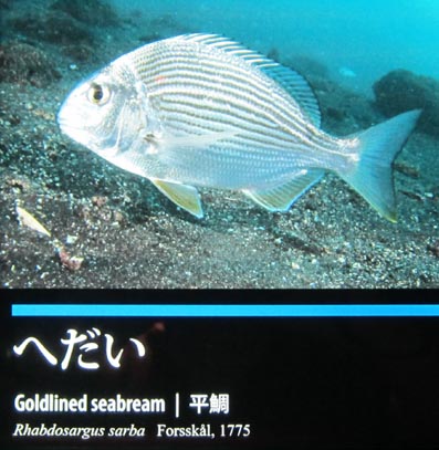 /goldlined seabream: n.ヘダイ, [学名]Rhabdosargus sarba Forsskål, 1775 [画像 (z22143.jpg)/京都水族館]. /silver bream: n.[魚]ヘダイ; ブリッカ(=white bream)[小型のブリームで、マスの餌]. /stumpnose: n.[魚]ヘダイ(平鯛)[太平洋・インド洋の熱帯地方産]. /tarwhine: n.ヘダイ. heddohead: n.ヘッド [参照]水頭(すいとう).