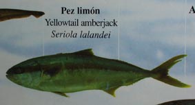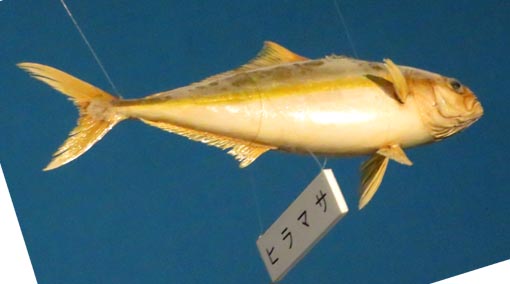 hiraku[魚などを]開く: hiramasa[魚]ヒラマサ: yellowtail, yellowtail amberjack, amberjack, [学名]Seriola lalandi, [西語: アルゼンチン] pez limón [スズキ目(Carangiformes)アジ科ブリ属の海水魚; アジ科魚類のうちで最大種; 食用] [ヒラマサ:画像(z22590.jpg)/平戸市生月町博物館・島の館][画像(z369.jpg)].
