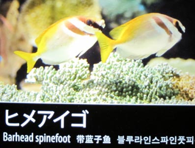/aulopus: n.ヒメ科. hime-aigo[魚]ヒメアイゴ: → blue-lined spinefoot: n.[魚]ヒメアイゴ、マジリアイゴ. hime-akagaiヒメアカガイ: lesser ark-shell. hime-akagutsu[魚]ヒメアカグツ: smoky batfish. hime-ankou[魚]ヒメアンコウ: Moseley's goosefish. barhead spinefoot: [魚]ヒメアイゴ [画像(z22216.jpg) /サンシャイン水族館]. hime-asariヒメアサリ: short-neck clam. hime-bashouヒメバショウ: three angled murex. hime-budai[魚]ヒメブダイ: [学名]Scarus oviceps [ブダイ科]. hime-dai[魚]ヒメダイ: → crimson snapper: n.[魚]ヒメダイ、オオヒメ. hime-dara[魚]ヒメダラ: dwarf hakeling [チゴダラ科]. hime-ebisu[魚]ヒメエビス: silver squirrelfish. hime-ezo-bora[貝]ヒメエゾボラ: neptune whelk.