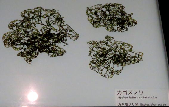 kago-kamasu[魚]カゴカマス: silver kingfish. kagome-chidorigasa[貝]カゴメチドリガサ: canellated false limpet. kago-matoudai[魚]カゴマトウダイ: pink dory. kagome-nawabora[貝]カゴメナワボラ: grey heiry shell. kagome-noriカゴメノリ: [学名]Hydroclathrus clathratus [カヤモノリ科(Scytosiphonaceae)][画像(z22734.jpg)/熊本博物館]