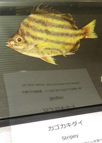 /halfmoons: n.[魚]カゴカキダイ科. /stripey: n.[魚]カゴカキダイ; [学名]Microcanthus strigatus [画像(z22359.jpg) /しながわ水族館][画像(z25081.jpg)/むろと廃校水族館].