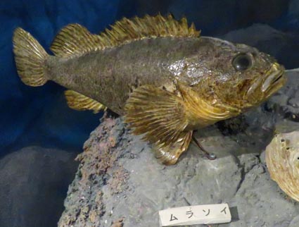 murasame-mongara[魚]ムラサメモンガラ: prickly file-fish. murasoi[魚]ムラソイ: spotbelly rockfish, [学名]Sebastes pachycephalus [ムラソイ:画像(z22612.jpg)/平戸市生月町博物館・島の館].