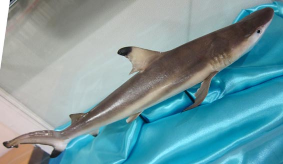 ではない [メジロザメ目メジロザメ科; 性格はおとなしく、全長1.6~2m; マグロとは無関係で、「端っこ(ツマ)が黒い(グロ)」という