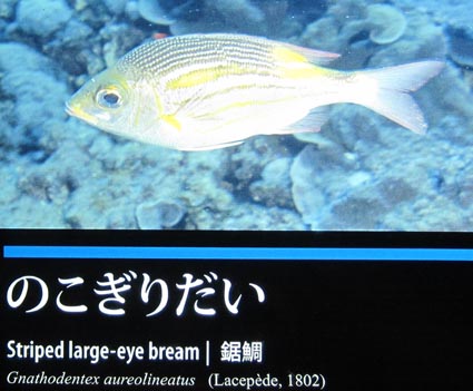 Gymnogobius isaza: [魚]イサザ. Gymnogobius urotaenia: [魚]ウキゴリ, [英名]forktongue goby. Gymnomuraena zebra: ゼブラウツボ. Gymnosarda unicolor: イソマグロ. Gymnothorax chlamydatus: クルマウツボ. Gymnothorax eurostus: カワウツボ. Gymnothorax favagineus: ヒョウモンウツボ. Gymnothorax flavimarginatus: ゴマウツボ(ドクウツボ). Gymnothorax gilberti: マサゴウツボ. Gymnothorax hepaticus: ヘリシロウツボ.