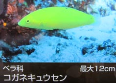kogane-kyuusen[魚]コガネキュウセン: [学名]Halichoeres chrysus. kogane-matsukasa[魚]コガネマツカサ: [学名]Myripristis pralinius Cuvier[イットウダイ科]. kogane-reishidamashi[貝]コガネレイシダマシ: golden rock shell, [学名]Morula aurantiaea (Hombron et Jacquinot)[アクキガイ科の巻き貝]. kogane-shimaaji[魚]コガネシマアジ: golden kingfish, [学名]Gnathanodon speciosus. kogane-shimaaji[魚]コガネシマアジ: golden trevally, banded trevally, [学名]Caranx speciosus (Forsskål) [アジ科]. kogane-suzumedai[魚]コガネスズメダイ: gold reeffish, [学名]Chromis xanthocir (Bleeker)[スズメダイ科]. kogane-yakko[魚]コガネヤッコ: yellow angle-fish, [学名]Centropyge flavissimus (Cuvier)[キンチャクダイ科]. kogarei[魚]コガレイ、小ガレイ: dab, small flatfish [小形のカレイ類の総称]. kogashirabera[魚]コガシラベラ: blunt-headed wrasse, [学名]Thalassoma amblycephalus (Bleeker)[ベラ科]. kogashira-iruka[動]コガシライルカ: small-headed porpoise, [学名]Stenella microps [マイルカ科の歯鯨類]. kogashira-nezumi-iruka[動]コガシラネズミイルカ: cochito [参考]通称バキータ。メキシコ北西部の カリフォルニア湾にのみ生息. kogatakinchaku[貝]コガタキンチャク: Strange's scallop, [学名]Decatopecten strangei (Reeve)[イタヤガイ 科の二枚貝]. kogatamakkoukujira[動]コガタマッコウクジラ: [参照]マッコウ. kogatanatsumomo[貝]コガタナツモモ: minute strawberry top, [学名]Clanculus margaritarius (Philippi) [ニシキウズ科の巻き貝]. kogata-purankuton小型(小形)プランクトン: microplankton. kogechanishikinina[貝]コゲチャニシキニナ: Melvill's latirus, [学名]Latirulus melvilli (Schepman) [イトマキベラ科の巻き貝]. kogenina[貝]コゲニナ: decollated clusterwink, [学名]Quoyia decollata (Quoy et Gaimard)[ゴマフニナ科の 巻き貝]. kogeraishikakegai[貝]コゲライシカケガイ: Iceland cockle, [学名]Clinocardium ciliatum (Fabricius) [ザルガイ科の二枚貝]. kogereishidamashi[貝]コゲレイシダマシ: brownish rock shell, [学名]Morula marginatra (Blainville) [アクキガイ科の巻き貝]. koguruma[貝]コグルマ: yellow sundial, [学名]Phillippia radiata (Röding)[クルマガイ科の巻き貝]. kogurumigai[貝]コグルミガイ: smooth nut clam, [学名]Ennucla tenuis (Montagu)[クルミガイ科の二枚貝]. kohada[魚]コハダ: shad(→ コノシロ). kohakudama[貝]コハクダマ: stellate moon, [学名]Natica stellata (Hedley)[タマガイ科の巻き貝]. kohakuhimeji[魚]コハクヒメジ: sunride goatfish, yellow goatfish, [学名]Upeneus sulphureus Cuvier [ヒメジ科]. kohariiruka[動]コハリイルカ: Burmeister's porpoise, black porpoise, [学名]Phocaene spinipinnis Burmeister [ネズミイルカ科の歯鯨類]. kohirehadaka[魚]コヒレハダカ: northern lampfish, [学名]Stenobrachius leucopsarus (Eigenmann et Eigenmann) [ハダカイワシ科].