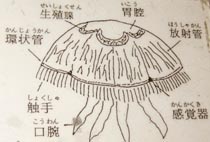 日本近海で最も普通に見られるクラゲ; 体の95%が水; 傘の縁に並んだ短い触手で小型のプランクトンを捕える; ヨツメクラゲ