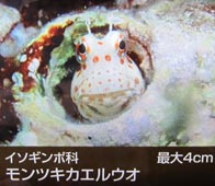 montsuki-kaeruuoモンツキカエルウオ: montsuki-sodegai[貝]モンツキソデガイ: maculate stromb, [学名]Dolomena variabilis (Swainson) [スイショウガイ科の巻き貝]. montsuki-suzumedai[魚]モンツキスズメダイ: [豪・NZ]dark-finned damsel-fish, [学名]Pomacentrus melanopterus Bleeker [スズメダイ科]. montsuki-ushinoshita[魚]モンツキウシノシタ: V-marked sole, [学名]Heteromycteris matsubarai Ochiai [ササウシノシタ科].