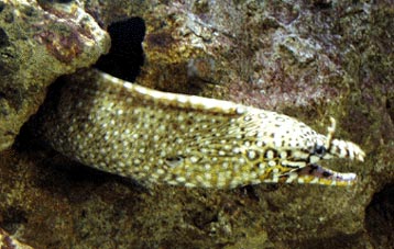 (Orectolobiformes)トラフザメ科(Stegostomatidae); 黄褐色の体表全体が黒い小斑紋で覆われる; 卵生(単卵生)]