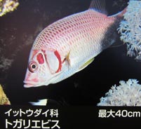 togemenuke[魚]トゲメヌケ: rosethorn rockfish, deepwater scratch-tail, [学名]Sebastes helvomaculatus Ayres [カサゴ科]. togemizuhikigani[動]トゲミズヒキガニ: [学名]Latreillopsis bispinosa Henderson [ミズヒキガニ科]. togemoku[藻]トゲモク: [学名]Sargassum microcanthum Yendo [ヒバマタ目・ホンダワラ科の褐藻類]. togemomijigai[動]トゲモミジガイ: sand seaster, [学名]Astropecten polyacanthus Müller et Troschel [アスツロペクテン科のヒトデ類]. togemushiro[貝]トゲムシロ: spiny dog whelk, [学名]Scabronassa quadrasi (Hidalgo)[オリイレヨウバイ科 の巻き貝]. togenagayugoi[魚]トゲナガユゴイ: Bonin flagtail, longspin flagtail, [学名]Kuhlia boninensis (Fowler) [ユゴイ科]. togenashibiwagani[動]トゲナシビワガニ: [学名]Lyreidus stenopus Wood-Mason [アサヒガニ科]. togenisesuzume[魚]トゲニセスズメ(トゲニセンスズメ): five-spined cicholops, [学名]Pseudochromis quinquedentatus McCulloch [メギス科]. togereishidamashi[貝]トゲレイシダマシ: spiny rock shell, [学名]Spinidrupa aurantha (A. Adams) [アクキガイ科の巻き貝]. togesakeebi[動]トゲサケエビ: lancer rose shrimp, [学名]Parapenaeus lanceolatus (Kubo) [クルマエビ科・サケエビ属]. togeshako[動]トゲシャコ: prawn-killer, mantis-shrimp, [学名]Harpiosquilla raphidea (Fabricius) [シャコ科の甲殻類]. togesuzume[魚]トゲスズメ: [参照]ナガサキスズメダイ. togetanabatauo[魚]トゲタナバタウオ: striped scottie, [学名]Ernogrammoides fasciatus Chen et Liang [トゲタナバタウオ科]. togetanabatauo-ka[魚]トゲタナバタウオ科: dottybacks, [学名]Acanthoclinidae [硬骨魚綱・スズキ目・スズキ亜目 の1科]. togetengunishi[貝]トゲテングニシ: spinous stair shell, [学名]Hemifusus kawamurai (Habe)[テングニシ科の 巻き貝]. togetosakaトゲトサカ: giant octoral. togetsunomata[藻]トゲツノマタ: [学名]Chondrus armatus Okamura [スギノリ目・スギノリ科の紅藻類]. togetsunoyadokari[動]トゲツノヤドカリ: [学名]Diogenes edwardsi (De Haan)[ヤドカリ科].