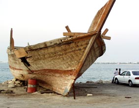 この朽ち果てたようなダウ船の舳先下から夕刻の摩天楼を見上げた。
