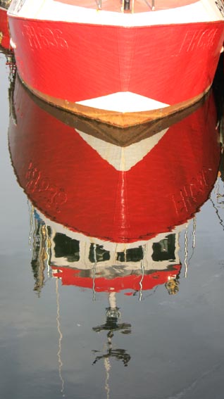 赤い船体が水面に映える。水面に映えるその赤が一層鮮やかに見える時もある (下記画像 0)。美しく、平和なプリモスの船溜まり