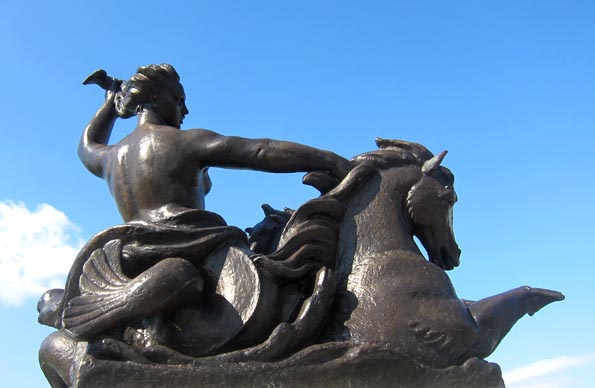 海戦記念柱は二つ彫像(A&B)によって守られている。画像Aは、ギリシア神話における海を司る神「ポセイドン Poseidon」である。