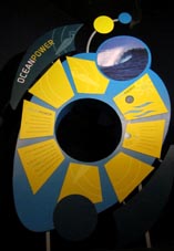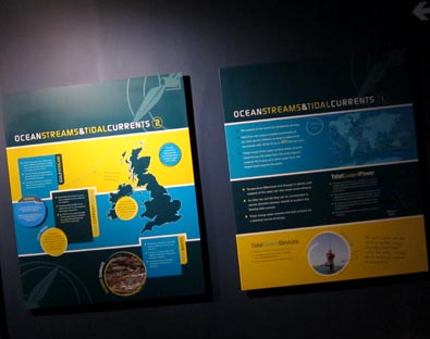 「英国の海からのパワーとエネルギー」と題する展示では、海のエネルギー源である波力、潮力・潮汐、温度差、海流、