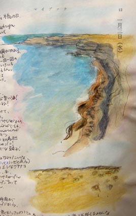 画像 (右上) は断崖に縁どられた海辺と、低灌木の荒涼とした大地の広がる陸の風景をスケッチしたものである。