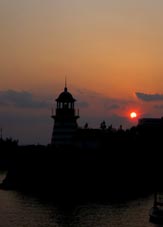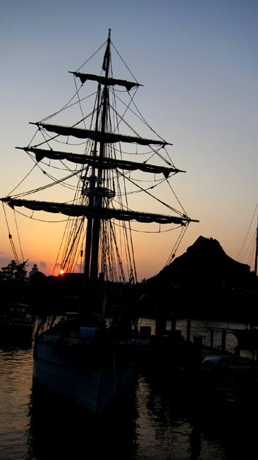 夕暮れ時、「プロメテウス火山」を背景にして、茜色とブルーの天空に映し出された2本のマストとヤードの美しいシルエット。