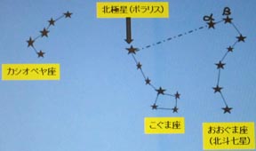 を5倍ほど「カシオペヤ座」の方向へ伸ばしたところに輝く(はずであるが、北極星を見つけられないまま時間切れとなる)。