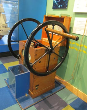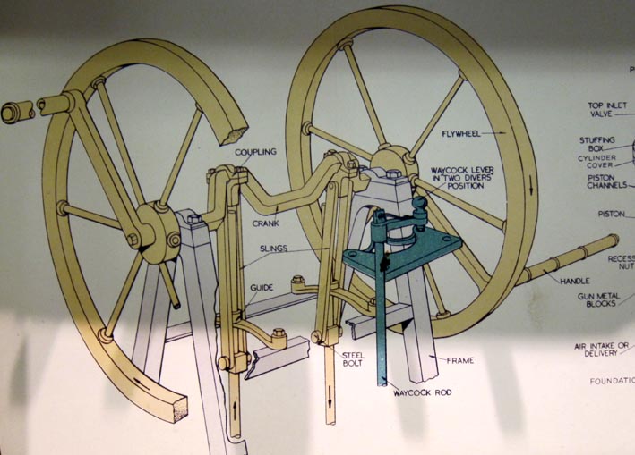 画像 1 はヘルメット式潜水服および送気ポンプの写真である。 画像 2 は実物展示の送気ポンプである。右側の大きなハンドルを回すことで、太いホースを通じて水中で作業する潜水夫に圧縮空気が送られる。 画像 3 はそのポンプの内部構造を覗いて接写したものである。 [To be coontinued]