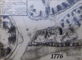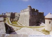 1 2![]() 1. モーロ要塞の平面図。図の左側には湾内へ通じる水道が横たわる(画像3はその水道から城塞を見上げたところである)。 要塞はカリブ海沿いの出っ張りの上に築造されている。海は南側 (図でいえば下側) に広がる(画像2の地形図参照)。 [拡大画像: x26884.jpg: 要塞平面図] 2. モーロ要塞周辺の1776年の地形図。楔形の出っ張りの先端にモーロ要塞が築かれた。その西側には湾奥に通じる水道が伸びる。 [拡大画像: x26905.jpg]