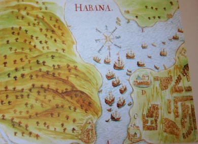 図4は、スペイン植民地時代ハバナ湾内に数多くの船が停泊する様子を描いている。図中央下方に湾内に通じる1kmほどの水路 (Canal) が描かれる。