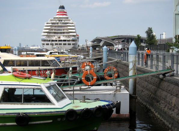 画像は横浜の大桟橋の付け根から先端方向を眺望したものである。突堤に横付けされる大型クルージング船は「飛鳥 II」である。 正船尾から見ると、「彼女」はどんぐりの実ような美麗なスタイルをしている。右側の建物は鯨の背をイメージした 外航船ターミナルである。