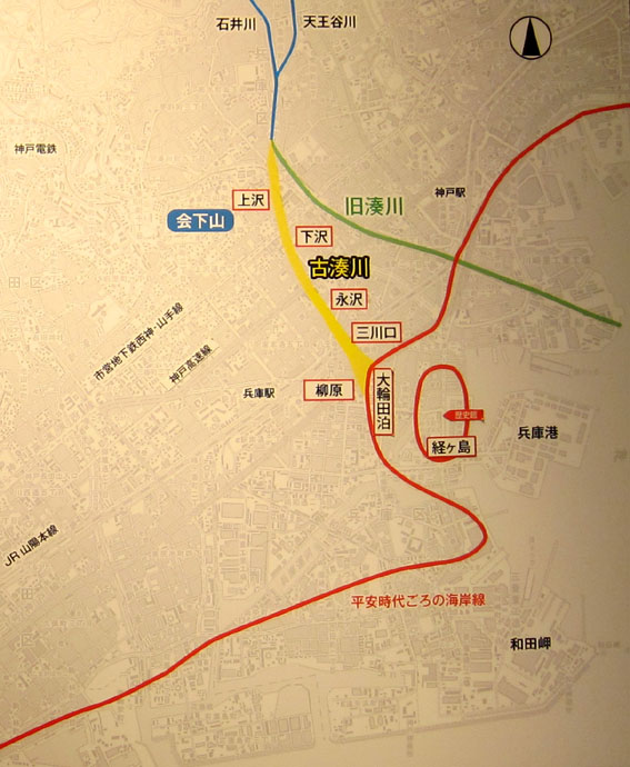 1156年保元の乱、1159年平治の乱。 1168年、清盛51歳の時に出家する。 1173年、平清盛が経ヶ島を築造する。 1180年、福原に遷都する。 1181年、清盛、享年64歳で死去する。 1184年一ノ谷の戦い、1185年屋島の戦い、壇ノ浦の戦いで平氏は滅亡する。 1192年、源頼朝が征夷大将軍となる。 1333年、鎌倉幕府が滅びる。 1338年、足利尊氏が征夷大将軍となる。 1404年、日明の勘合貿易が開始され、兵庫津が繁栄する。 ![]() 赤色線は平安時代ごろの海岸線。図中央に大輪田泊、その東側地先に平清盛が1173年に築造したという経ヶ島がある。緑色線は旧湊川。 経ヶ島の築造のため土砂を調達した塩槌山 (しおつちやま) のあった会下山 (えげやま) も記される。 [拡大画像: x27475.jpg] |