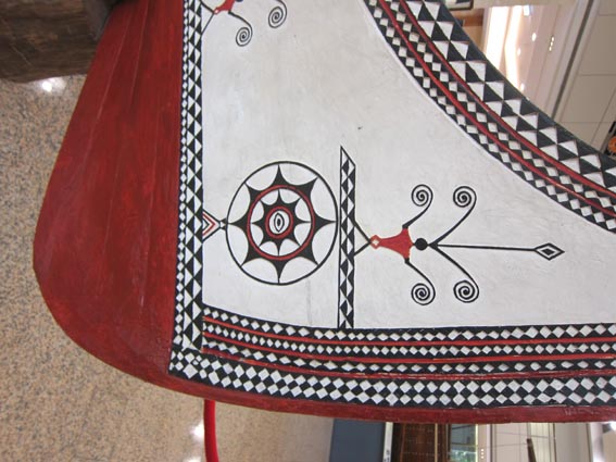 建造1988年、縮尺1:1、木製、大きさ: 610×142×218㎝ 画像の外板平張りボートは台湾南東沖に浮かぶ蘭嶼島にて建造された。蘭嶼島には台湾の一先住民族であるタオ族が住んでいる。 そのボートは縁のある外板に取り付けられた4本の綱結わい杭 (ティアズ tiers) を含む27つの木の部材からなる。 また、せり上がった船首部と船尾部をもつ。彼らは船首尾先端に鳥の羽をもって飾り付けするとともに、その両舷側には、 崇め奉る祖先のイメージを描いている。ダイヤモンド形による装飾的縁取りは波を表わす。船首部の白と黒の二重円は、 豊漁の航海へと導くボートの目を表わしている。 This carvel-built boat was made on Orchid Island (Lan Yu), which is situated off the southeast coast of Taiwan. Its residents are the Taos, one of Taiwan's aboriginal tribes. Carvel-built boat consists of 27 pieces of wood including 4 tiers of edged planks and has a raised bow and stern. Islanders decorate their craft with feathers on the bow and stern, with painted images of their revered ancestors on both sides. The diamond border represents waves, while the double circles in black and white on the bow represent the boat's eyes, which seek bountiful fishing trips. [台湾紀行: 2017.2.27-3.6/博物館訪問: 2017.3.3][拡大画像: x27501.jpg][拡大画像: x27504.jpg: 目を表わす文様] [拡大画像: x27502.jpg: 英文説明書き][拡大画像: x27503.jpg: 造船儀式の写真と説明] |