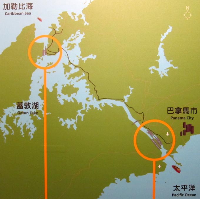 フランスのレセップスはかつてスエズ運河建設で培った経験を活かしてパナマ運河を建設しようとしたが、 熱帯ジャングル環境であったこと、黄熱病やマラリアのような熱帯病に阻まれもして、工事は難航を極めた。また財政難にも陥り、建設を 完遂することができず中途で放棄した。紆余曲折の末1904年に建設を引き受けた米国は、先ずは建設現場の衛生環境を整え、また運河 水面の高さと海水面のそれとを同じにする海面方式の構造設計を取り止めて「水の階段」方式を採用した。そして、ついに1914年の完成に 漕ぎ着けた。 運河拡張プロジェクトは2007年に始まり、2016年6月に9年を費やして完成した。新閘門を通航できる船舶の大きさの上限は、 長さ366メートル、幅49メートル、喫水15.2メートルである。新しい運河閘室は、コンテナ船について言えば、20フィートコンテナ積載 換算で14,000個のコンテナを積載する船舶をも通航させることができる。 従前の運河では通航できる船舶のタイプとサイズに制約があった。閘室の制約上から、長さ294.13メートル超、幅32.3メートル超の 船は通航できなかった。 また、熱帯淡水満載吃水線は12.04メートルを超えることができなかった。この最大限界ぎりぎりの船は「パナマックス船」と呼ばれた。 そして、この限界を超える船は「ポストパナマックス船」と呼ばれていた。 新閘室が完成した現在では、全長366メートル、幅49メートル、喫水15.2メートルの最大限界ぎりぎりのコンテナ船は「ネオ・パナマックス船」 と呼ばれる。 従前の閘門で船舶を通航させる補助手段としてウォータートラクター (water tractors) が用いられたが、新閘門ではタグボートが 用いられる。なお、展示のジオラマ模型には以下のような説明が付されている。