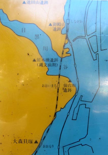 1![]() 1. 大森貝塚遺跡庭園のパネルに展示される「大森貝塚に人が住んでいた時期(縄文後晩期)と現在の海岸線」の図。(最左下)大森貝塚の 位置。[出典: 品川区立大森貝塚遺跡庭園] [拡大画像: x28220.jpg]