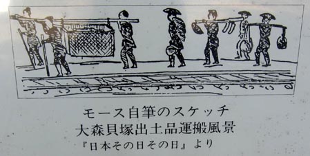 2![]() 3 4![]() 米国人の動物学者エドワード・シルヴェスター・モース博士(Dr. Edward Sylvester Morse)が、1877年(明治10年)6月、横浜から新橋 に向かう車窓から大森貝塚を発見した。同博士はそこで土器、石器、人骨など多数の資料を発掘した。後にその成果を「大森貝塚発掘調査報告書 Shell Mounds of Omori」として刊行した。その発掘と刊行は、その後における日本の考古学・人類学の学術的発展に大きく貢献した。 また、日本の先史文化に関する知見を海外へ広めることにつながった。