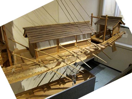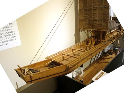 説明パネルには以下のように記される。模型は「北野天神絵巻」(承久本)に描かれた和船をモデルにして製作された。 12人漕ぎで、250石(約25t)積みの船を縮尺1/10で復元したもの。中世の絵巻物に描かれた船は船首や船尾の 船底部が滑らかな曲面で表現されている。だが、この曲面を板張りで作ることは困難であることから、当時の船は刳り船 構造の準構造船であったと解される。 模型の船体中央部の船底構造について: 刳り抜き材3材を左・中・右の横列に継ぐ → もう一対を前後方向に継ぐ → 船首と船尾の刳り抜き材をそれら6材の前後に継ぎ足す。船底部は合計8材からなる。2段からなる舷側板をそれぞれの 舷上部に取り付けられている。 動力は櫓と帆の兼用。帆は筵(むしろ)でできている。帆走は基本的に順風時のみで、櫓走の時は帆柱を倒して航行した。 刳り船構造の準構造船は弥生時代末に出現して以降、1,000年以上にわたって国内水運の主役として使われ続けていた。 [画像撮影: 2017.3.17 横浜市立歴史博物館にて][拡大画像: x27539.jpg][拡大画像: x27542.jpg] |