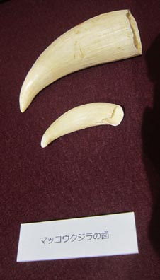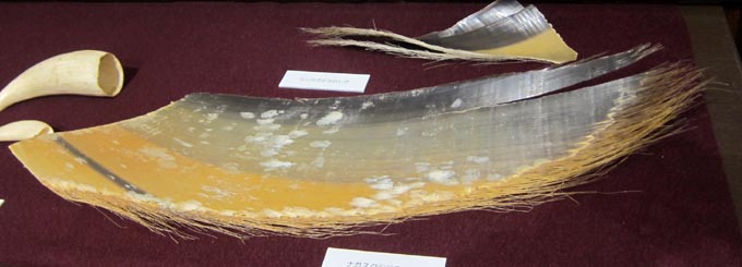 内湾漁業の3つのサブテーマをもって紹介されている。 コミュニケーションルームには、極ごく一部の骨格が欠損するものの、ミンククジラ(ナガスクジラ科)のほぼ完全な全身の骨格標本が 展示される。捕獲は宮城県鮎川。本標本は東京慈恵会医科大学の標本館に収蔵されていたが、1998年 (平成10年) に港区に寄贈された。 ミンククジラはヒゲクジラ (鬚鯨) の仲間である(歯をもたず、鬚をもつ鯨類)。体長は9メートル前後になる。ほぼ全世界中の海に 棲息する。ナガスクジラ科のなかでは最小である。 画像2上隅の小さな鬚はミンククジラのもの、中央の大きな鬚はナガスクジラのものである。 [画像撮影: 2018.12.13 東京・港区立郷土歴史館にて/都営地下鉄三田線・東京メトロ南北線の白金台駅下車、2番出口徒歩1分; 港区白金台4-6-2 ゆかしの杜内][1-拡大画像: x28399.jpg][2-拡大画像: x28400.jpg] |