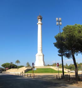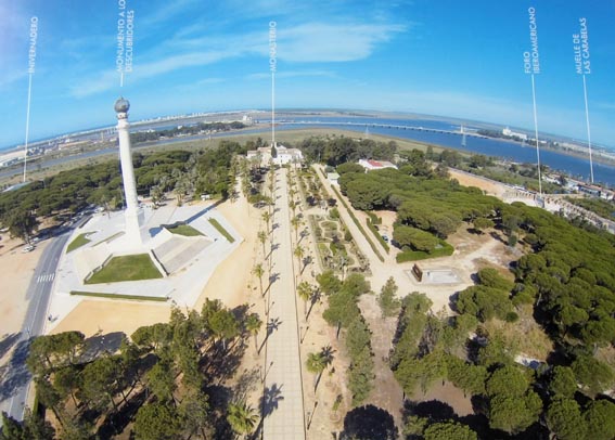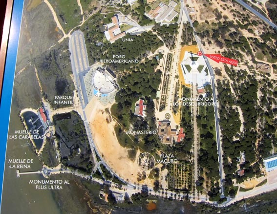 4![]() 左端に「発見者たちのモニュメント」、中央上方に「ラ・ラビダ修道院」。右上端に「カラベラ船団の桟橋(Muelle de las Caraberas, La Rábida)」があり、サンタ・マリア号、ピンタ号、ニーニャ号の3隻の実物大復元船が係留されている。 大河リオ・ティント川(Río Tinto)が右上端から流れ下る。その数km上流にパロス (Palos de la Frontera)という村がある。コロンブスの最初の航海では1492年にこのパロスから出帆した。