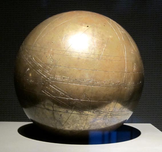 1. 撮影年月日: 2018年10月18日 2. 撮影場所: カタールの首都ドーハのイスラミック・アート博物館 3. 画像は天球上の星座・天体の位置を示す、17-19世紀のインドおよびトルコの天球儀(celestial globe)である。