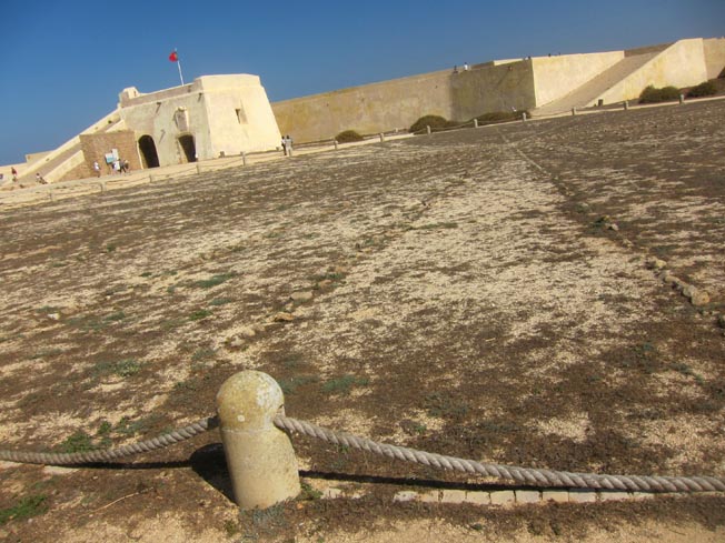1. 撮影年月日: 2018年9月26日 2. 撮影場所: ポルトガル南部のアルガルヴェ地方サグレス岬(Ponta de Sagres)の要塞敷地内にあるアルマス広場(Praça d'Armas) 3. 大西洋に細長く突き出るサグレス岬の中ほどに、16世紀に造営されたという堅牢な要塞がある。この要塞が岬へのアクセスを遮断している。 要塞の門をくぐり抜け敷地内に入ると、そのすぐ前にアルマス広場と呼ばれる広々とした空間が広がる。 画像の丸い大きな円形造営物は、15世紀に造られたという「ローザ・ドス・ヴェントス(rosa-dos-ventos)」と呼ばれる 方位円盤配されている。ある書物によれば「風光盤」とも記されている。画像1はそれを要塞のルーフから眺望したものである。 画像2では、各方位の境界を示す小石が配列されている。