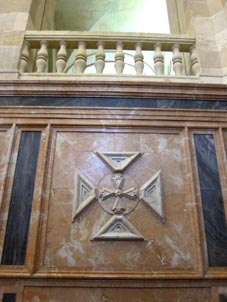 3![]() 3. 館の正面入り口1-2階踊り場に掲げられた紋章 4. 館内2階の展示回廊。8段書棚や陳列棚が左右に並ぶ。 | 4