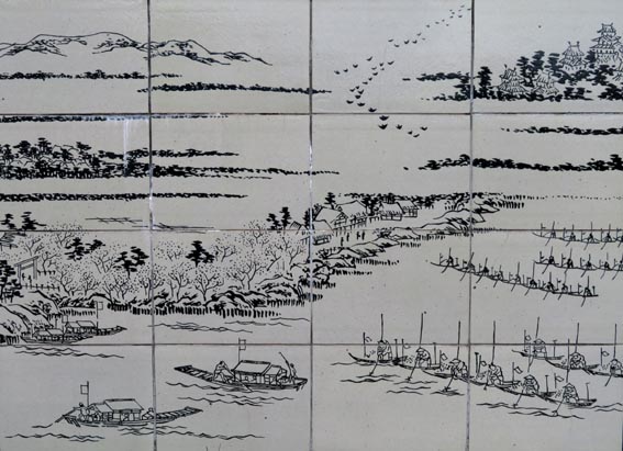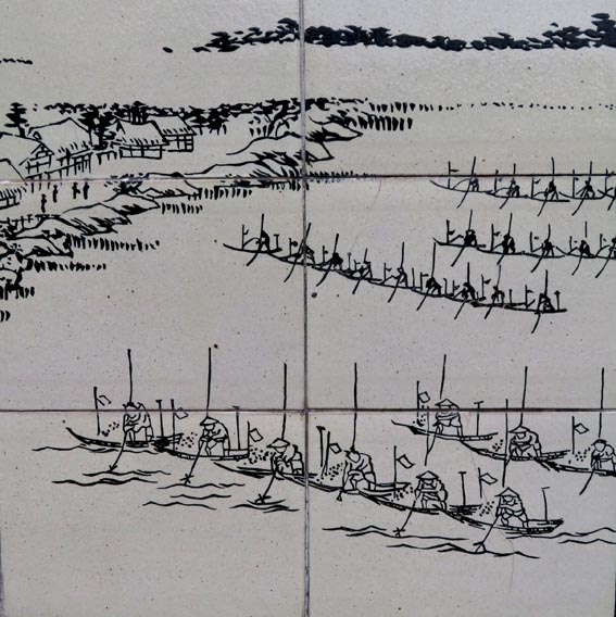 天保の大浚えは、まったくの人海戦術で行われました。人足が小船に乗り、長い柄の 幕府の命により工事の指揮をとったのは、町奉行所の与力や同心でした。500艘もの船を使い、大坂の各町や問屋仲間等 からたくさんの人足が加勢として参加し、揃いの衣装に鳴物入りで大変なお祭り騒ぎになりました。 (出典: 大阪城天守閣蔵品より) * この陶板は、上記原資料に基づき、構図・色彩などの特徴を出来るだけ生かして再現したものである。