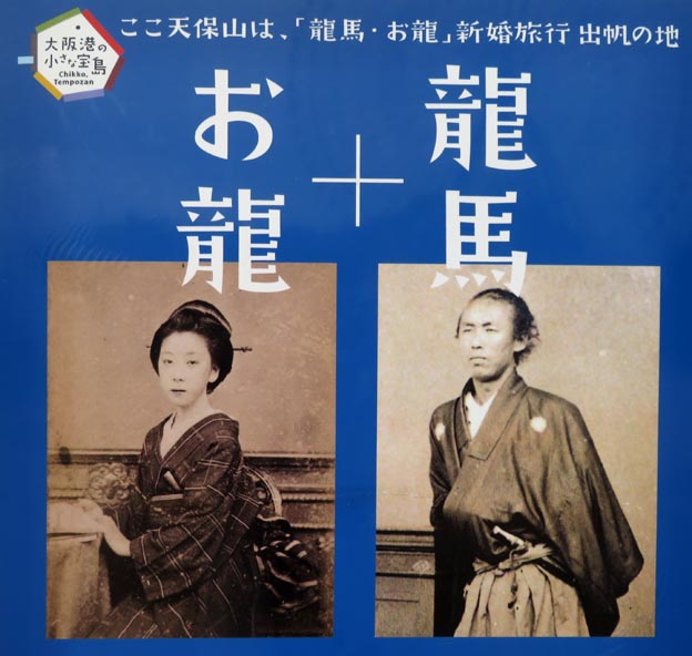 さて、江戸時代末期の慶応2年3月、坂本龍馬・お龍が西郷隆盛に勧められて、大坂・天保山から新婚旅行に出立した (龍馬が京都伏見の寺田屋にて、伏見奉行の襲撃を受け九死に一生を得た事件からわずか数ヶ月後における旅立ちであった)。 画像は坂本龍馬・お龍の肖像写真である。(出典: 同公園内に立てられた、二人の旅立ちを紹介する案内板より)