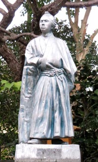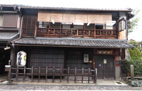 3![]() 1. 京都伏見の「京橋」のたもとにある船着き場と運河。燈籠の左側の住居の裏手に「旅籠・寺田屋」がある。 2. 旅籠の「寺田屋」。龍馬はここで襲撃に遭った。龍馬は、下図中央左寄りの「寺田屋」から、その左斜め上にある運河沿いの材木小屋に避難し、 追っ手を逃れることができ九死に一生を得た。 3. 「寺田屋」の敷地内に建立された龍馬の立像。