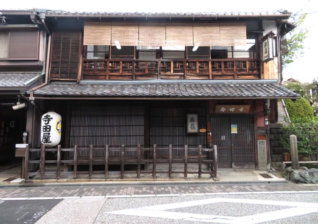 平安時代以来淀川では舟運が盛んであったが、江戸時代には 画像1. 現在の「旅籠・寺田屋」の全景。1862年(文久2年)4月、尊王攘夷派の先鋒であった薩摩藩士9名が殺傷されるという騒動が、 伏見の京橋近傍の寺田屋伊助の船宿「寺田屋」で起こった。 [拡大画像: x28785.jpg] [拡大画像: x28790.jpg: 説明書き/立札「寺田屋騒動址」][拡大画像: x28791.jpg: 説明書き/「お登勢明神」] 寺田屋: 江戸時代、伏見は、大坂と伏見の間を行き来していた旅人専用の三十石船や物の運送を専門にする船などで賑わった。寺田屋は 船を待つ客が泊まった船宿で、幕末には坂本龍馬が薩摩・長州との連絡に使った。寺田屋は「寺田屋騒動」の場であり、龍馬と妻お龍の出会いの 場でもあった。伏見はまた、角倉了以(すみくらりょうい)父子によって開削された高瀬川によって京都と結ばれる舟運の発着点でもあった。 それ故に、伏見は大坂と京都を結ぶ舟運の中継地と言えた。 画像1の寺田屋址に掲示される銘板「お登勢明神」によれば、お登勢とは寺田屋第6代女将であった。寺田屋は江戸時代より伏見南浜と大坂八軒屋の淀川間を 三十石船で往来する船宿を営んでいた。江戸時代末期、1847年頃に18歳で第6代寺田屋伊助に嫁入りし、明治10年(1877年)に逝去した。 人の世話をすることを厭わない性分であったと言われる。