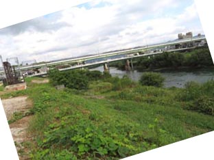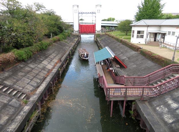 1![]() 他方の閘門(宇治川側にある閘門)から見た閘室(チャンバー chamber)風景。画像に写る閘門の後方水域は濠川(ごうかわ・ほりかわ)と 合流している。右端の館は三栖閘門資料館。 画像の小船は伏見市街地内の運河を巡る観光用十石船。