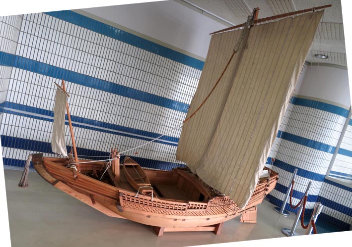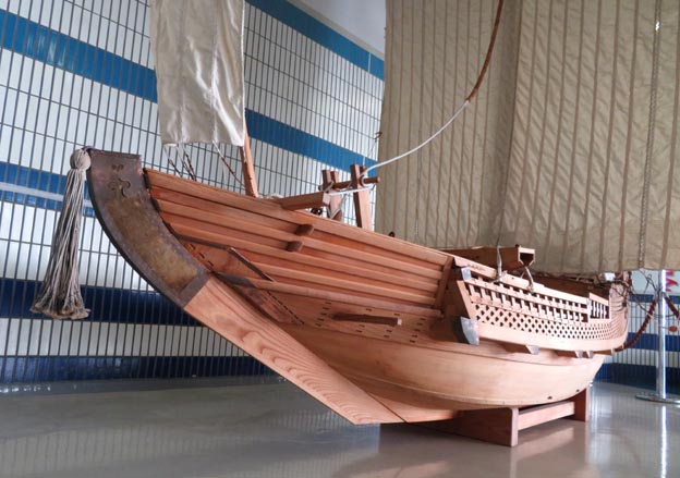 名古屋海洋博物館のある「名古屋港ポートビル」1階に待合・休憩室があるが、画像1~3は、そこに展示される千石船の模型である。