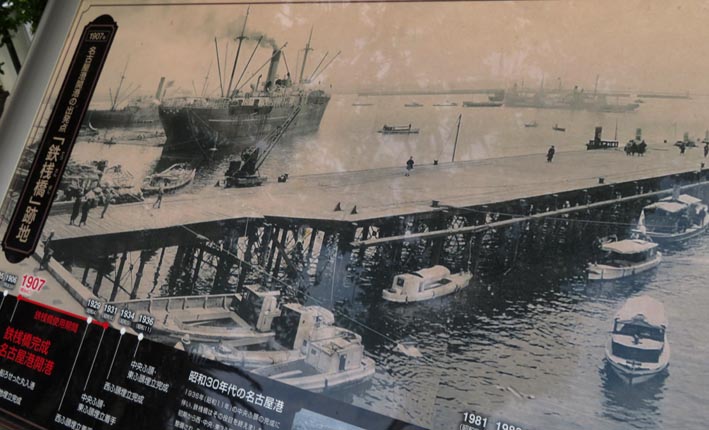 同パネルによれば、名古屋港は「鉄桟橋」の建設から始まった。それは名古屋港開港の1907年(明治40年)に建設された。 桟橋の長さは127m、幅は14.5mであった。その後、桟橋上部には貨物列車のレールが敷設された。開港から昭和初期までの唯一の船着き場として、 また名古屋港の代表的施設として、多くの大型船が発着し、港は大いに賑わった。因みに、桟橋には10,000トン級の船の入港が可能であった。