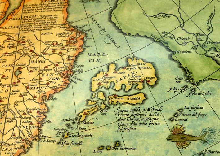 (1589年製: 複製)である。画像3は同図のうちの日本(IAPAN)の拡大図である。緯度は星の高度からほぼ正確に求められたが、経度は精密に