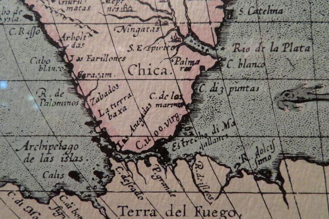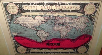 画像1は、オルテリウスが1587年に製作した「世界地図」(TYPVS ORBIS TETTARVM)の複製版である。 画像2はその地図の部分的拡大図である。アメリカ大陸と「南方大陸」がマゼラン海峡によって切り離されている。 海峡の南岸に「Tierra del Fuego(火の陸地)」と記される。現在の「フエゴ島」のことであろうが、地図では「南方大陸」の一部として描かれて いる。右上端には、マゼランが、探索の結果太平洋への水路ではなく川であることを確認した、その「Rio de la Plata(ラ・プラタ川)」が 記される。画像3は、博物館の展示意図として、オルテリウスの当初の地図ではアフリカ大陸南端やアメリカ大陸南端は「南方大陸」と繋がって 描かれていたことを示そうとしている。